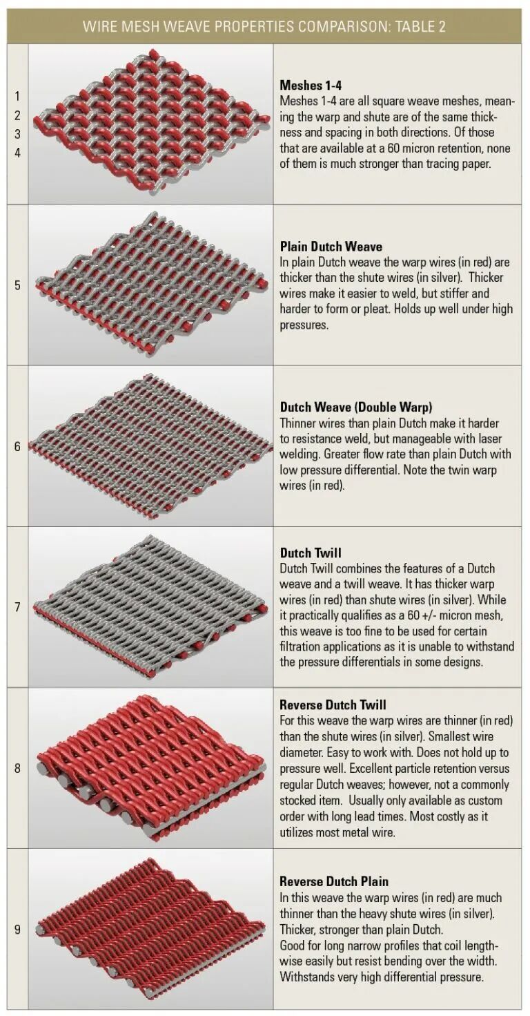 | Weave Type | Relative Strength | Open Area % | Filtration Efficiency |